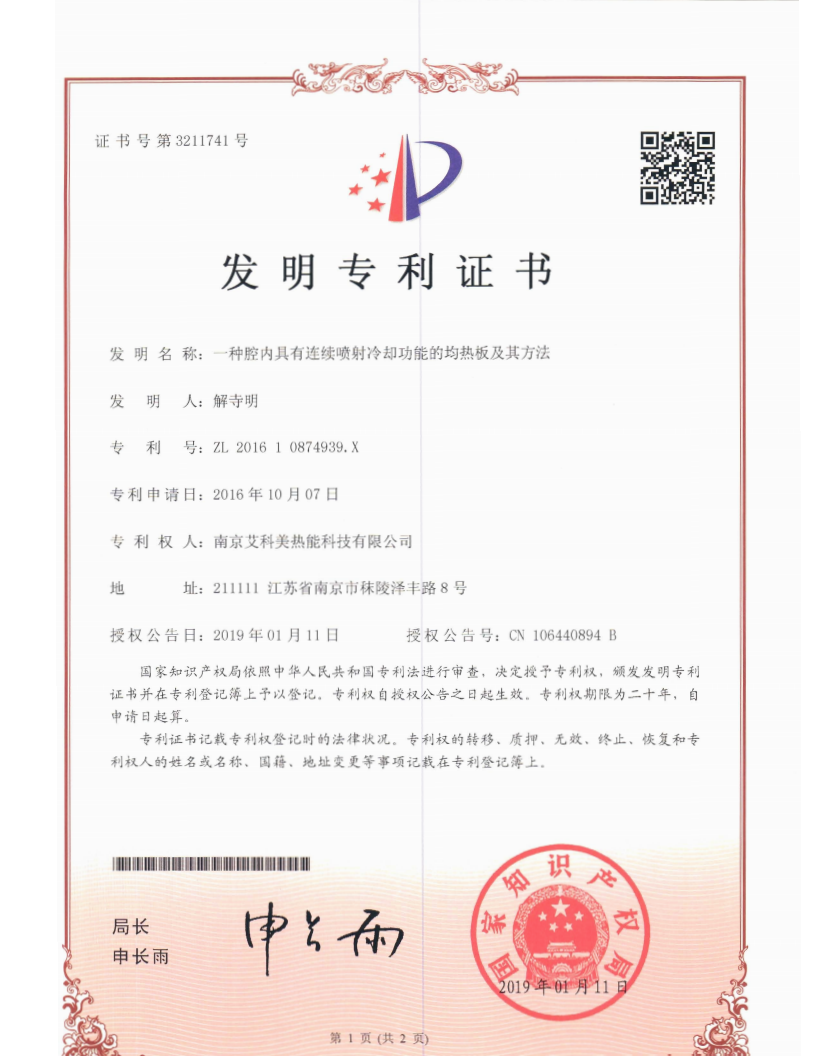發(fā)明專(zhuān)利——一種腔內(nèi)具有連續(xù)噴射冷卻功能的均熱板及其方法